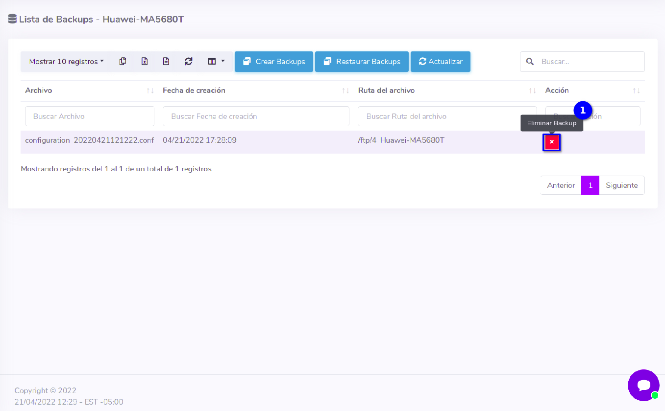 Al realizar estos pasos en su terminal, la OLT creara y mandara un respaldo en el servidor FTP de AdminOLT, el cual puede ser visualizado en la Lista de Backups