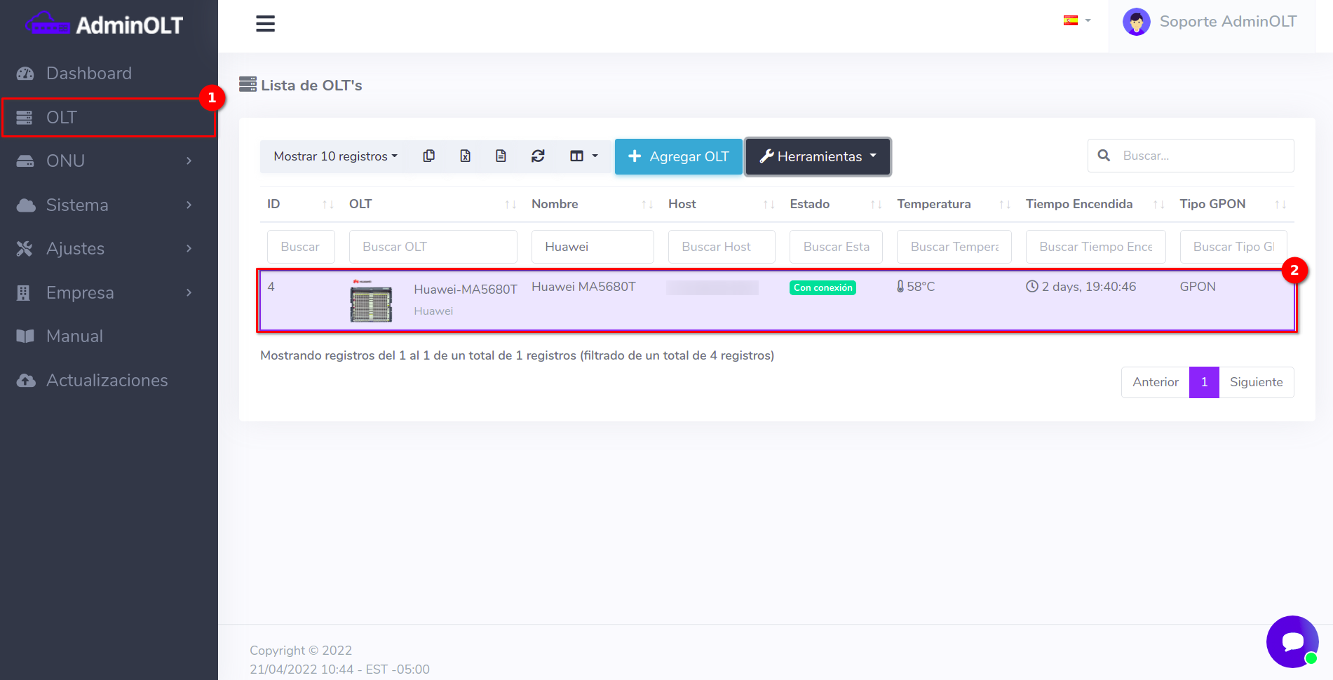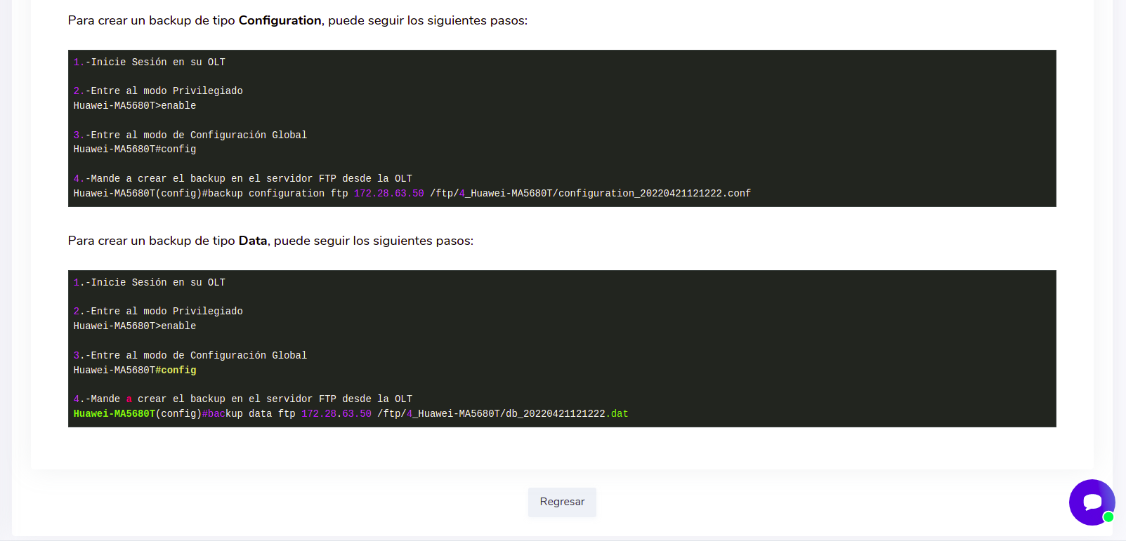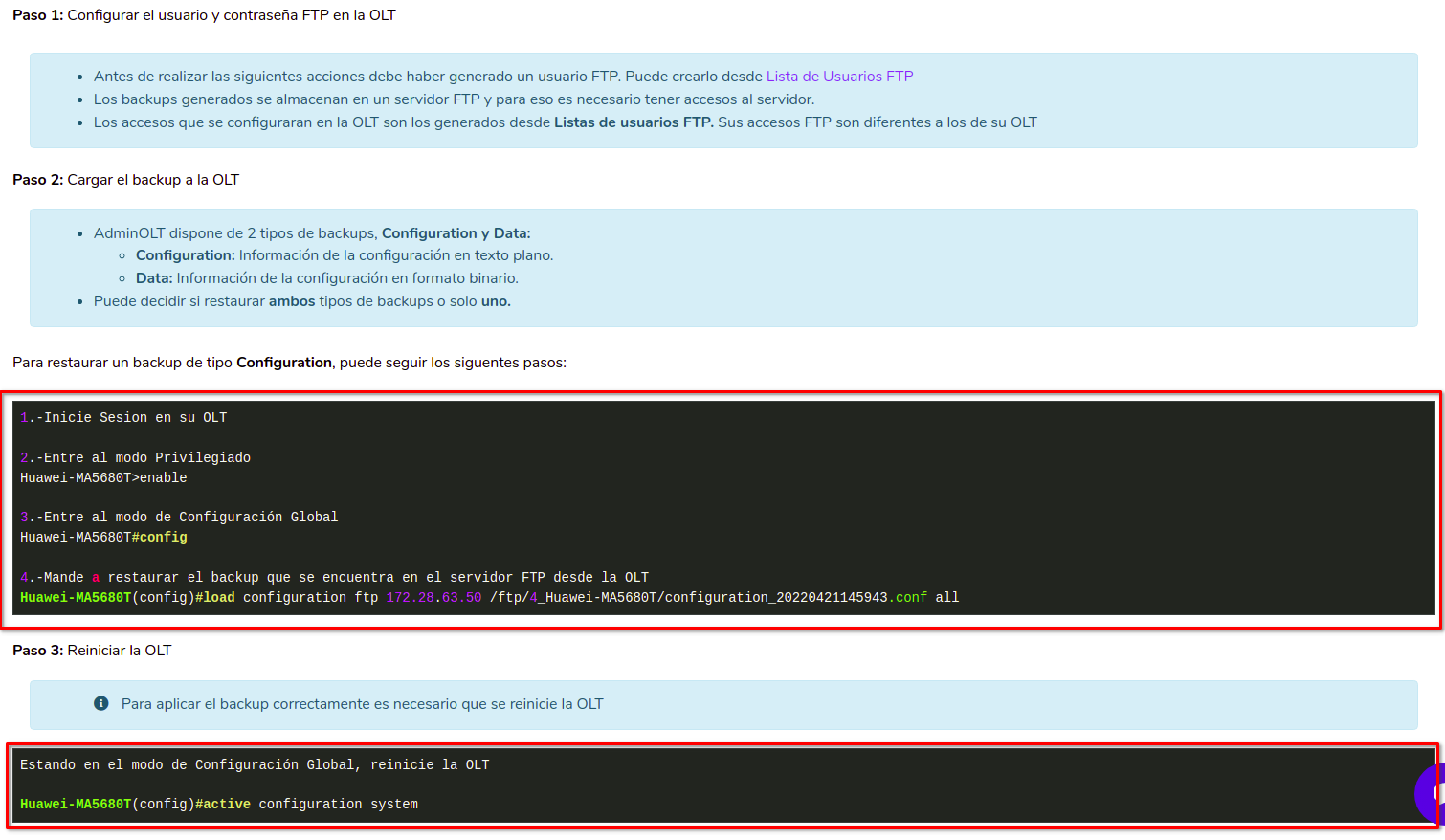 El sistema AdminOLT ofrece un acceso a un servidor FTP para el usuario. Esta información se configura en la OLT donde está última a base de los comandos específicos enviara la información al servidor antes mencionado. Si tiene dudas sobre donde conseguir estos accesos, puede consultar el siguiente manual. Usuarios FTP