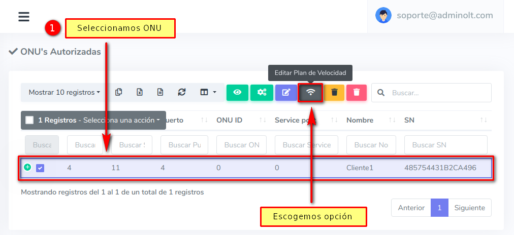 2 Seleccionamos la ONU y damos click en Editar Plan de Velocidad