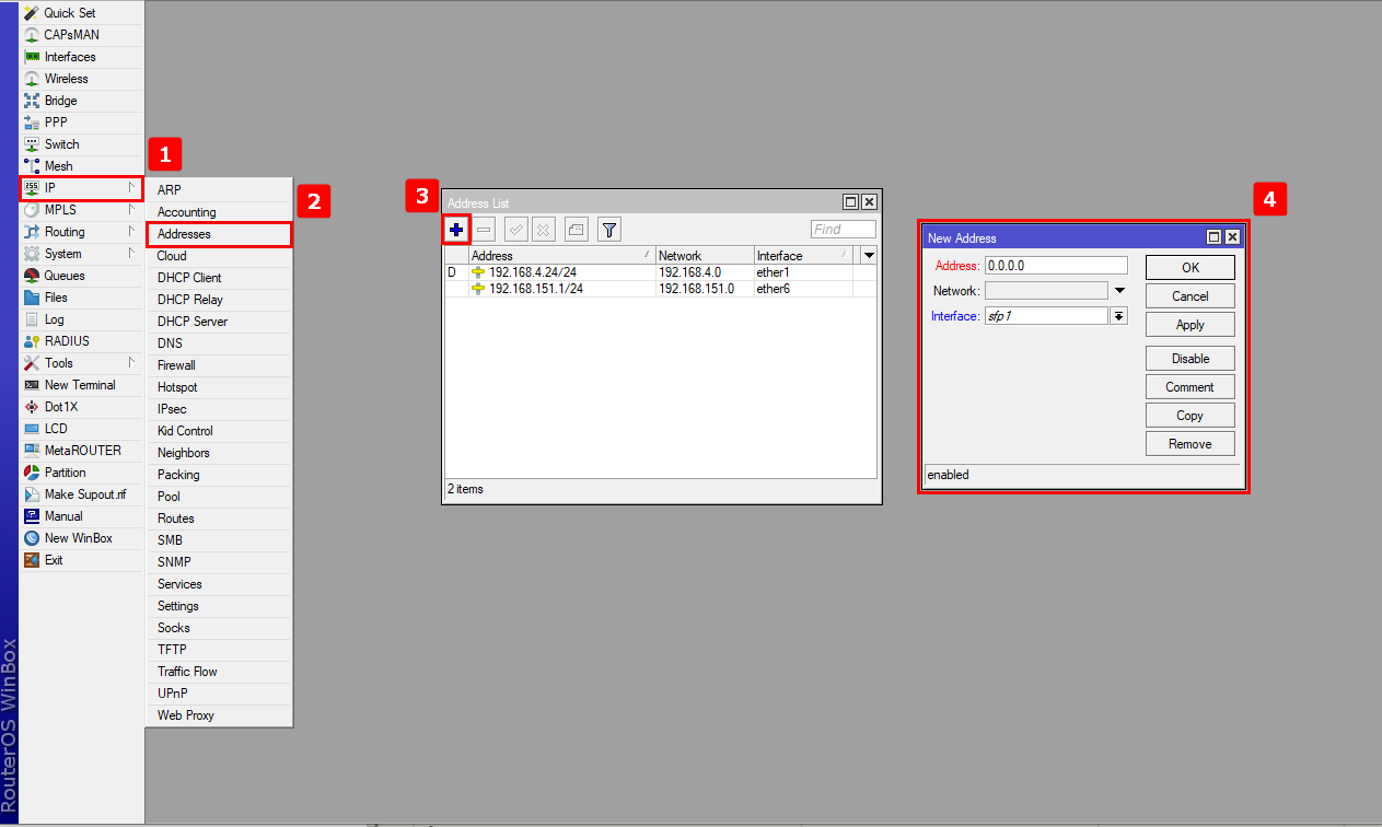 - 1.- Agregamos el segmento default de la OLT: 136.1.1.254/24 para que el Mikrotik tenga comunicación con la OLT