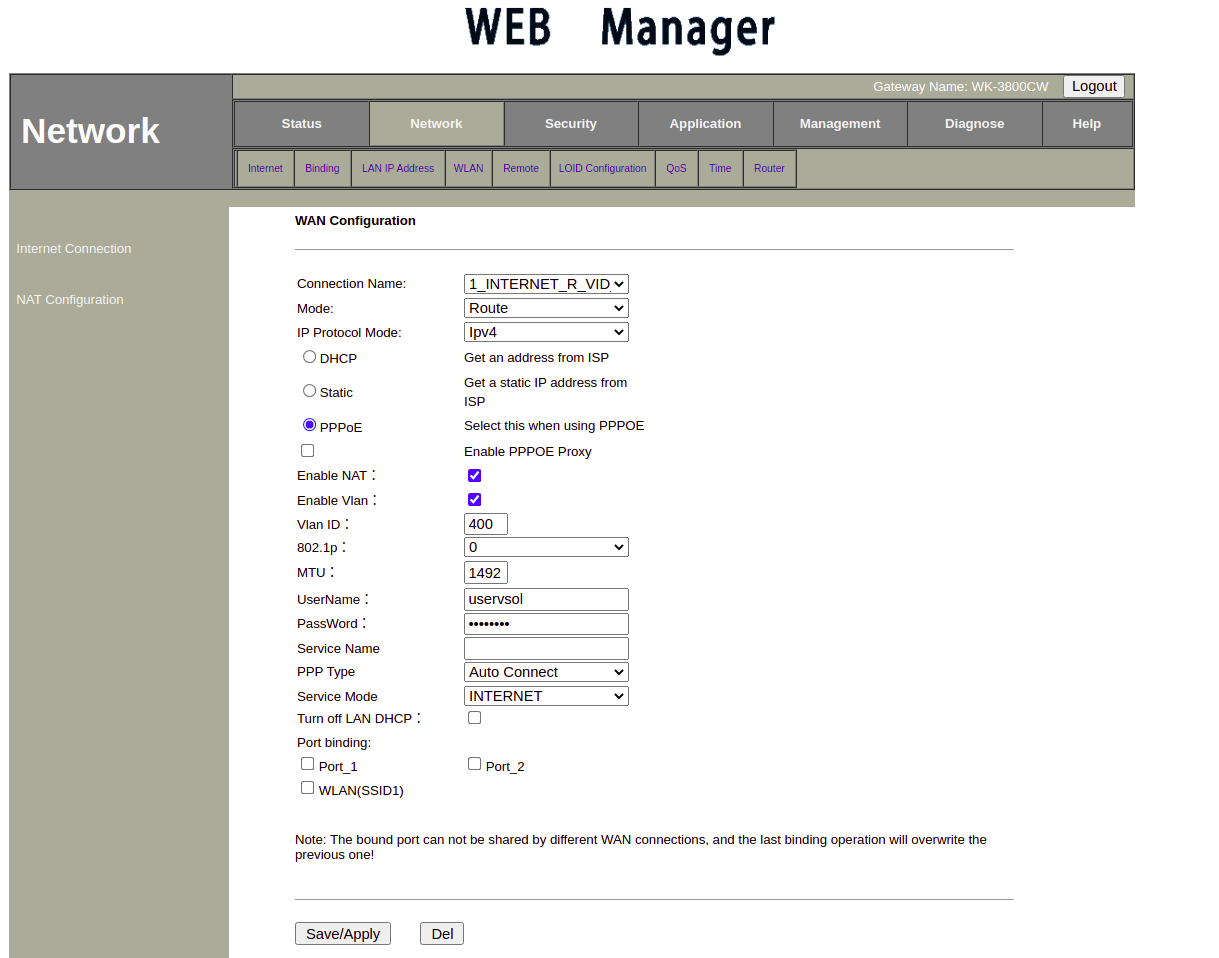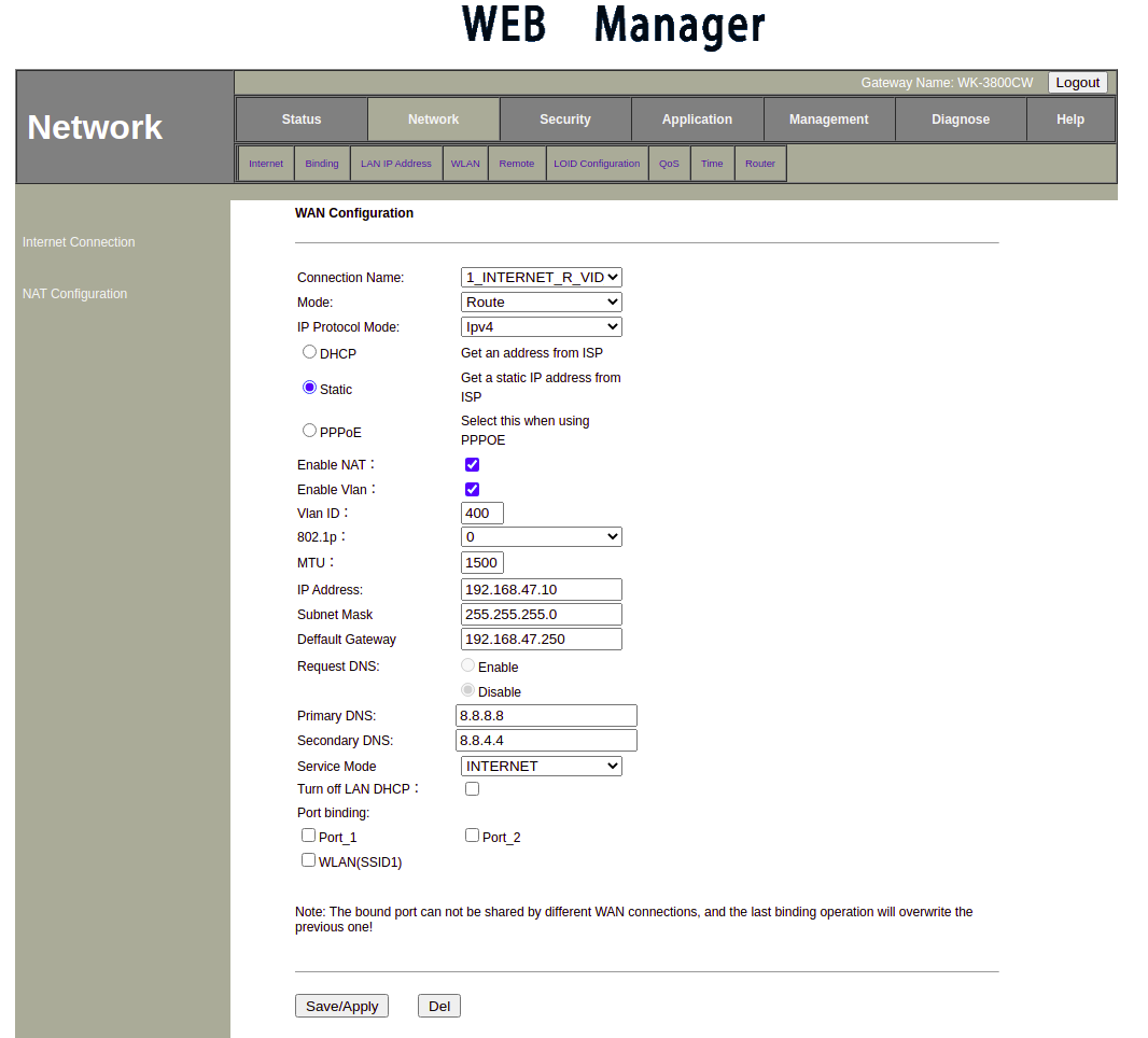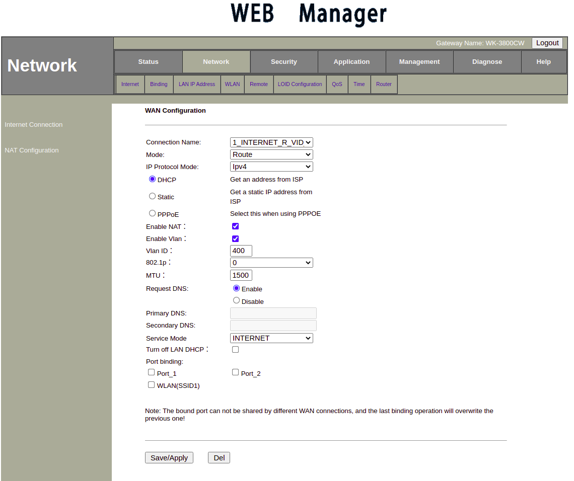 - 8.-Modo de WAN: El modo de WAN puede ser ROUTE o BRIDGE.