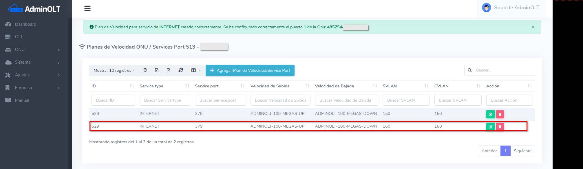 El nuevo plan de velocidad se mostrara en el listado de planes de velocidad