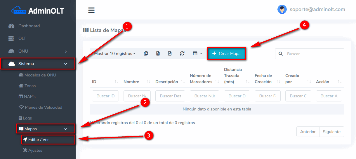Para poder crear un mapa en AdminOLT es importante que antes haya hecho una serie de pasos que explican en el artículo ¿Como configurar mi AdminOLT para crear Mapas?, una vez hechas estas configuraciones puede seguir con las siguientes instrucciones.