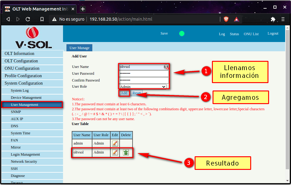 Crear usuario administrador Vsol EPON