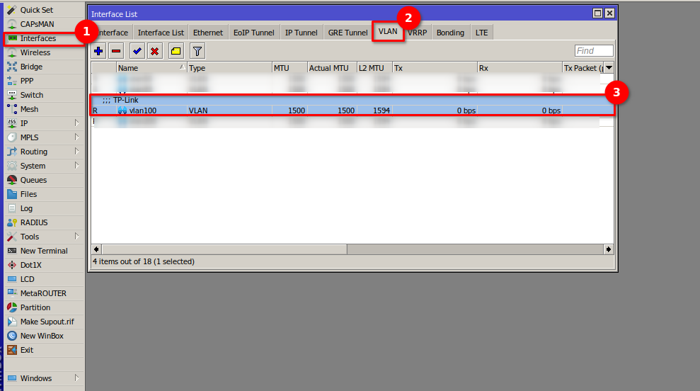 1 Para esto debemos dirigirnos en mikrotik a la sección de Interfaces > VLAN y agregar una VLAN con el puerto 100.