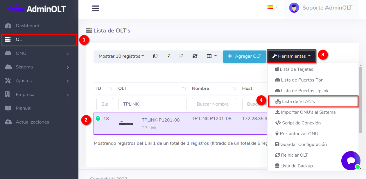 2 Después de agregar esta vlan en tu router, podremos agregarla en la OLT desde la Lista de OLT's seleccionando la OLT y la opción Lista de VLAN's.