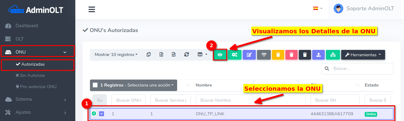 Pasos para editar información de ONU Autorizada en AdminOLT