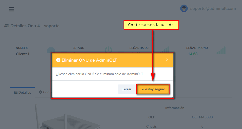 3 Confirmamos la acción de eliminar la ONU de AdminOLT