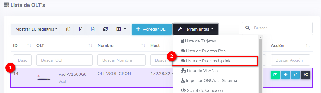 1En la Lista OLT's seleccionamos el equipo con el que trabajaremos para después ir a Puertos Uplink, que se encuentra en el botón con la leyenda Herramientas.