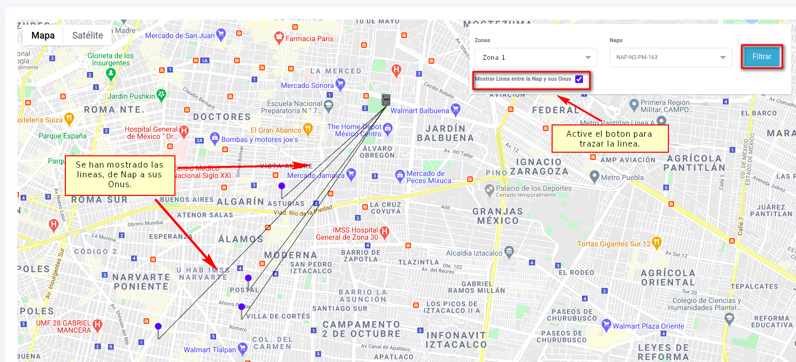 El mapa ofrece la opción de poder trazar una linea desde la Nap hasta las Onus que pertenecen a ella. Para esto solo active el botón que se muestra en la imagen y filtre.