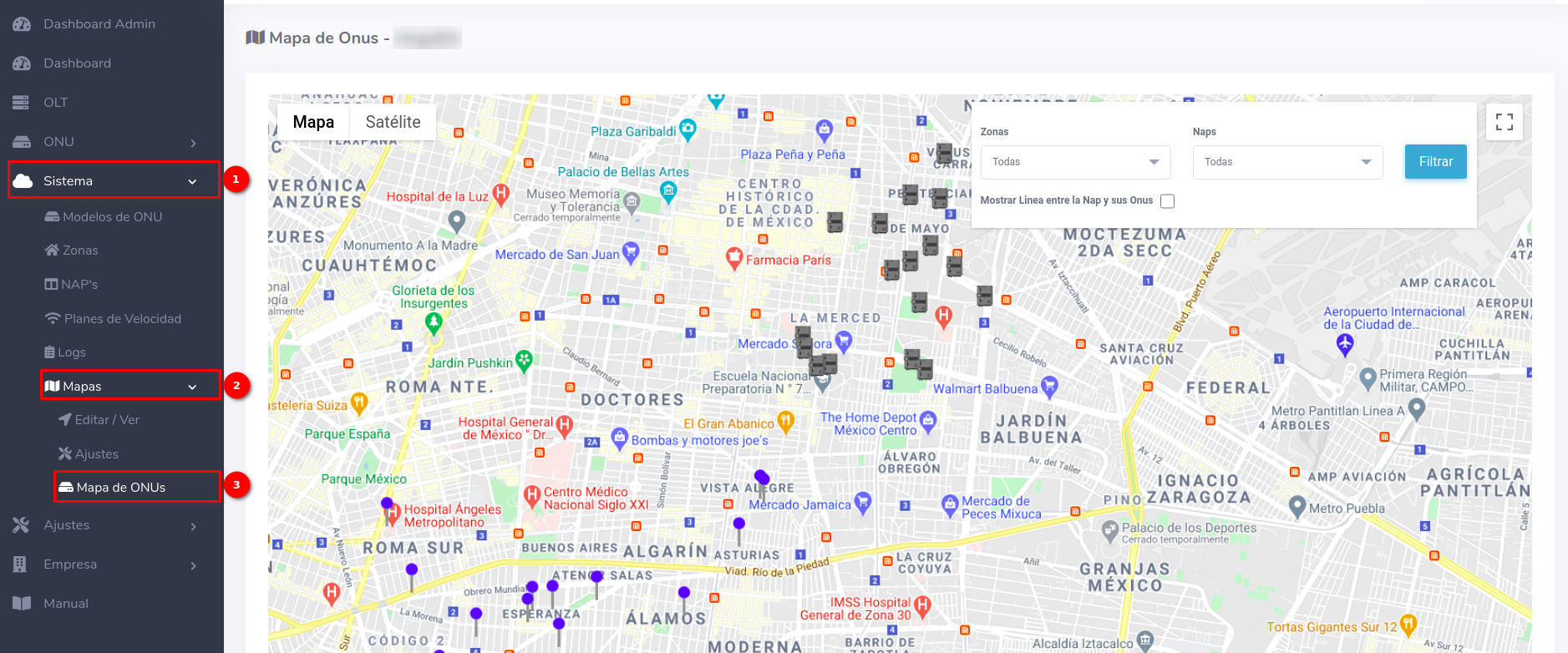 En AdminOLT es posible visualizar en un mapa las ONUS y NAPS que tenga registrados y si lo necesita puede filtrar los resultados por ZONA o NAP. Como nota es necesario que estos elementos tenga una ubicación registrada si no la tiene estos no aparecerán en el mapa.