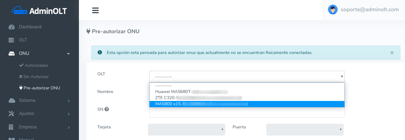 2Se mostrará un formulario que simplemente debe llenar. Primero elija en que OLT de su cuenta desea realizar esta acción.