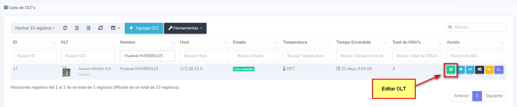 Para ello nos dirigimos a la lista de OLT y editamos la OLT