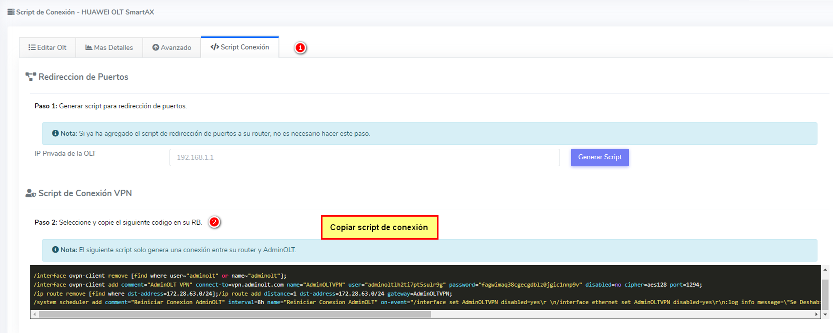 2Si la conexión es por VPN es necesario ir al apartado de script de conexión en la OLT en AdminOLT y copiar y pegar el script de conexión en el mikrotik